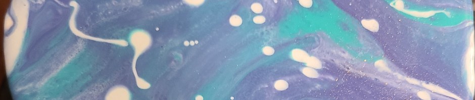 We put the cake in the freezer and made the mirror glaze, dividing it into three colors, white, purple, and teal. It is a very sticky mixture of gelatin, sweetened condensed milk, sugar, and white chocolate. It is sweet but it goes on so thin, it doesn’t overwhelm the cake.